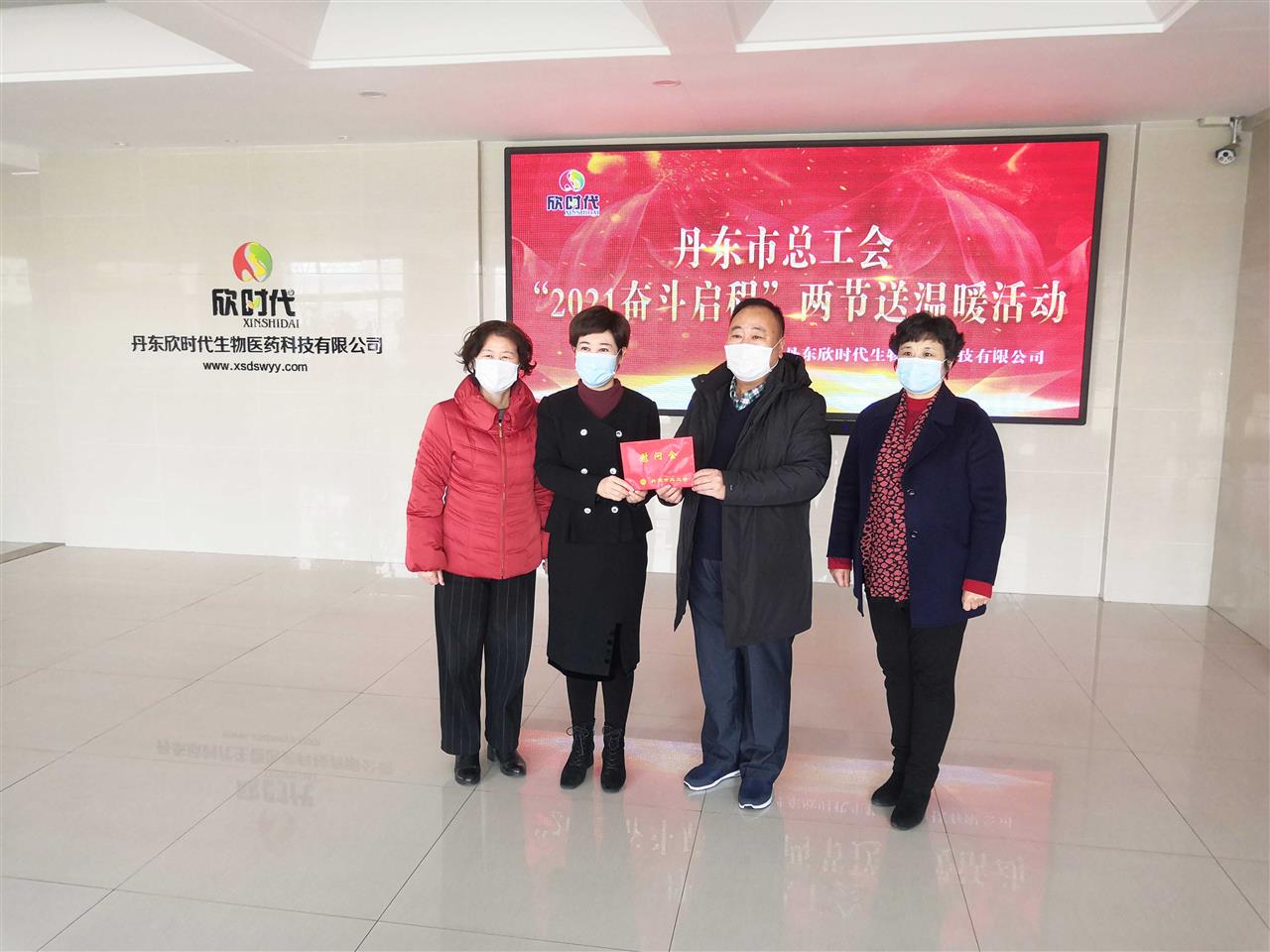 2021年1月14日,丹東市總工會(huì)牛主席與何副主席一行來到丹東欣時(shí)代生物醫(yī)藥科技有限公司為企業(yè)員工送溫暖。
