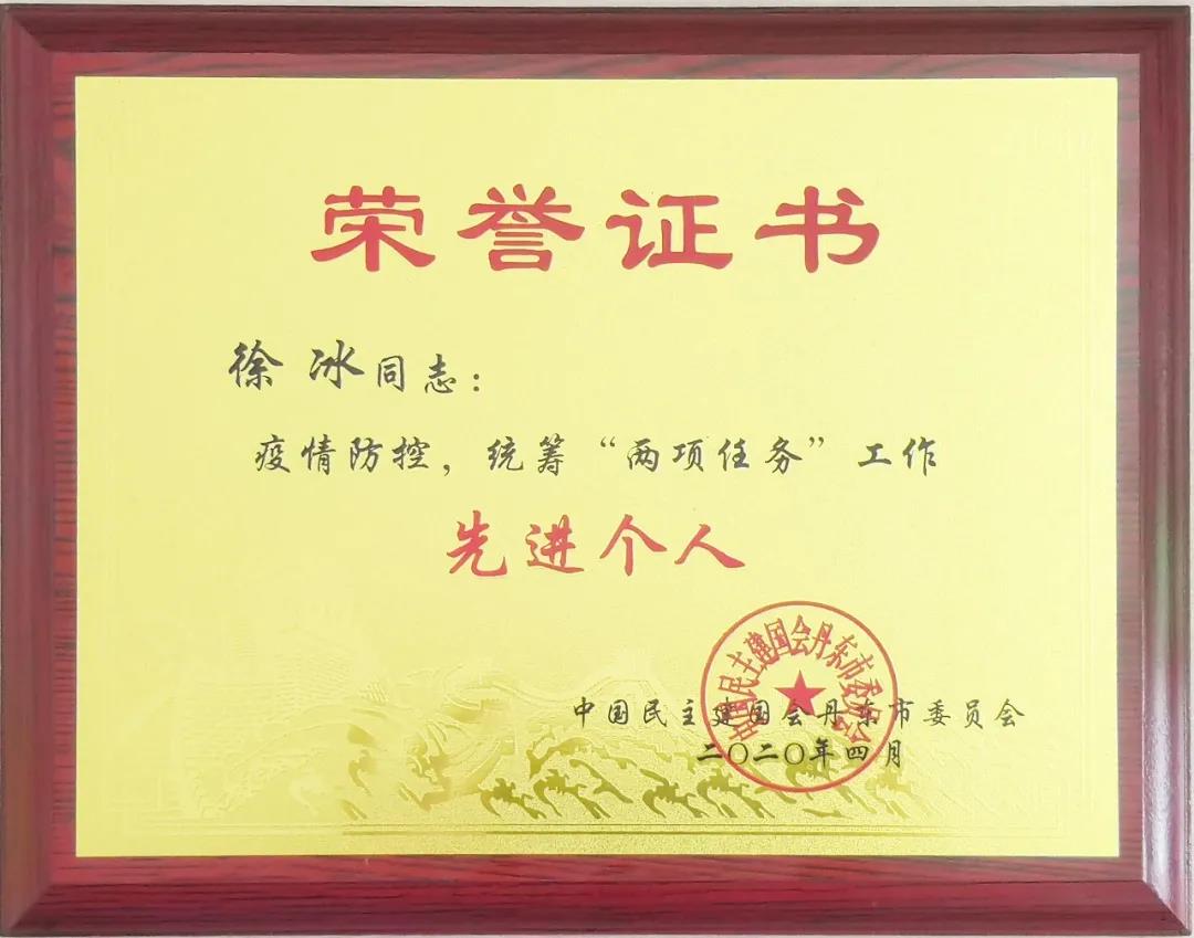 2020年4月15日中國民主建國會(huì)丹東市委員會(huì),授予丹東欣時(shí)代生物醫(yī)藥科技有限公司總經(jīng)理徐冰,丹東市疫情防控,統(tǒng)籌“兩項(xiàng)任務(wù)”工作先進(jìn)個(gè)人稱號(hào)。以表彰丹東欣時(shí)代生物醫(yī)藥科技有限公司總經(jīng)理徐冰在疫情防控期間所作出的突出貢獻(xiàn)。