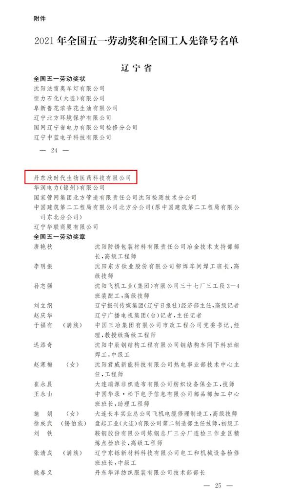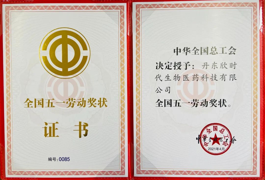 丹東欣時(shí)代生物醫(yī)藥科技有限公司被中華全國(guó)總工會(huì)授予“2021年全國(guó)五一勞動(dòng)獎(jiǎng)狀”。
